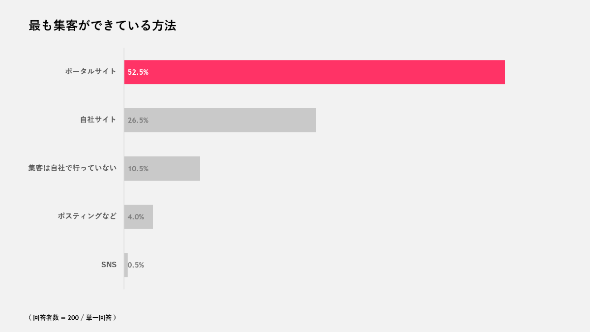 現在最も集客ができている方法について質問をしたところ、「ポータルサイト」が最多で52.5%、「自社サイト」が26.5%という結果になりました。