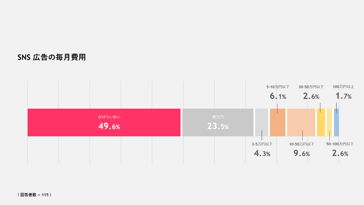一方で、毎月のSNS広告費用については「かけていない」が最多の49.6%、3-5万円以下である「数万円」が23.5%、「10-50万円」が9.6%という結果になりました。