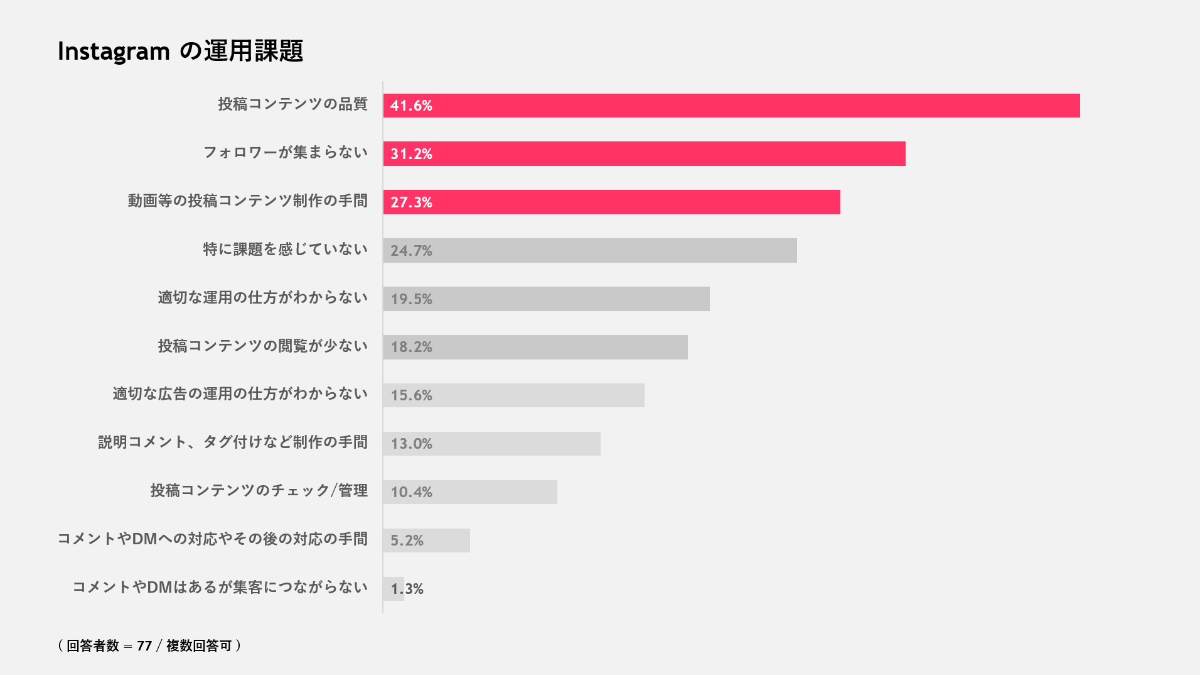 活用者数が最も多いInstagramについて運用課題について質問したところ、「投稿コンテンツの品質」が最多で42.4%、「フォロワーが集まらない」が32.2%、「動画当の投稿コンテンツ制作の手間」が27.1%という結果になりました。「特に課題を感じていない」という回答が24.7%となり、75.3%(4社中3社)が運用について課題を感じていることがわかりました。