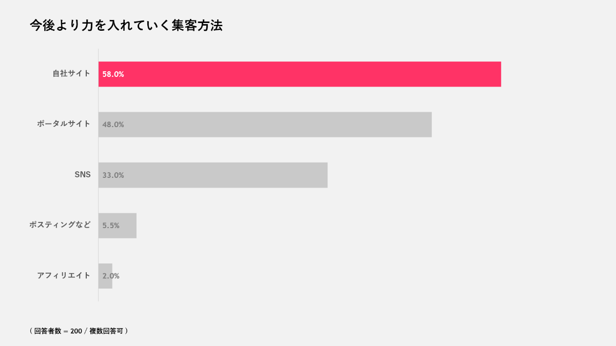 一方で、今後より力を入れていく集客方法について質問したところ「自社サイト」が最多で58.0%、「ポータルサイト」が48.0%、「SNS」は33.0%がという結果になりました。3社に1社がSNSに力を入れていくと回答しております。
