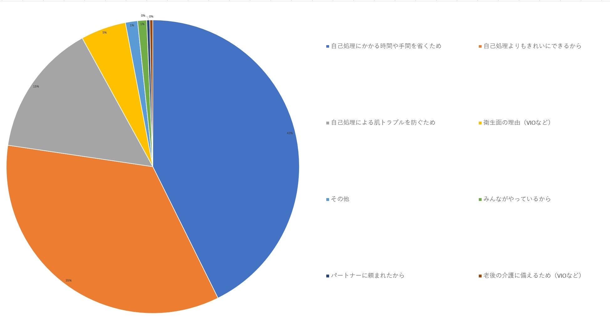 「脱毛をする最大の理由・目的はなんですか?」という質問では、「自己処理にかかる時間や手間を省くため」が43%、「自己処理よりもきれいにできるから」が35%と、大きな比率を占めています。また、これらを含む90%以上の回答は、自分のための脱毛を行っていることが読み取れます。