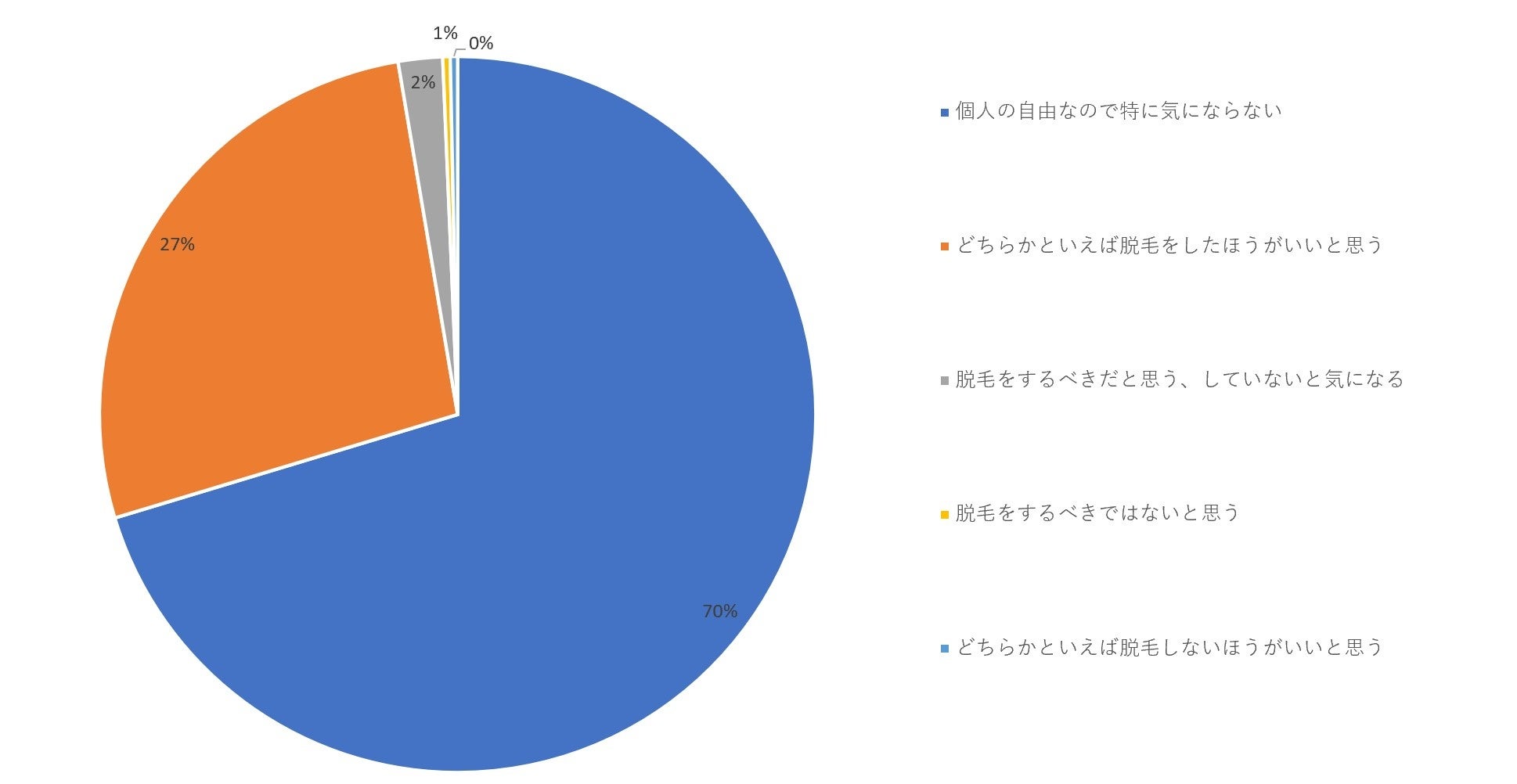 このように、自分に適した脱毛方法を模索する一方で、身近な人に対する脱毛の考えは少し異なり、70%が「個人の自由なので特に気にならない」と回答しています。
