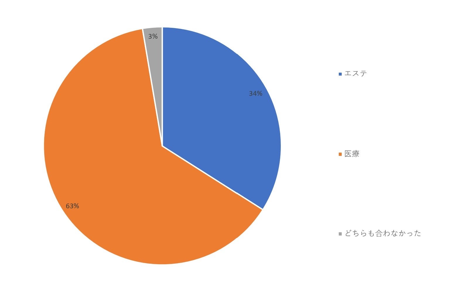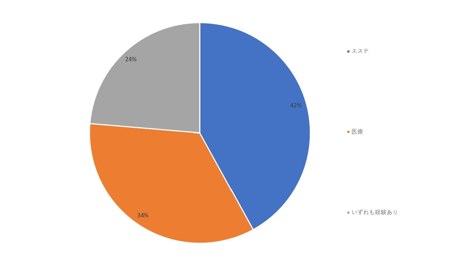 「エステ」が42%、「医療」が34%、そして「エステ/医療いずれも経験あり」が24%となり、「エステ」が他回答を上回っていますが、大きな差はないことがわかります。
