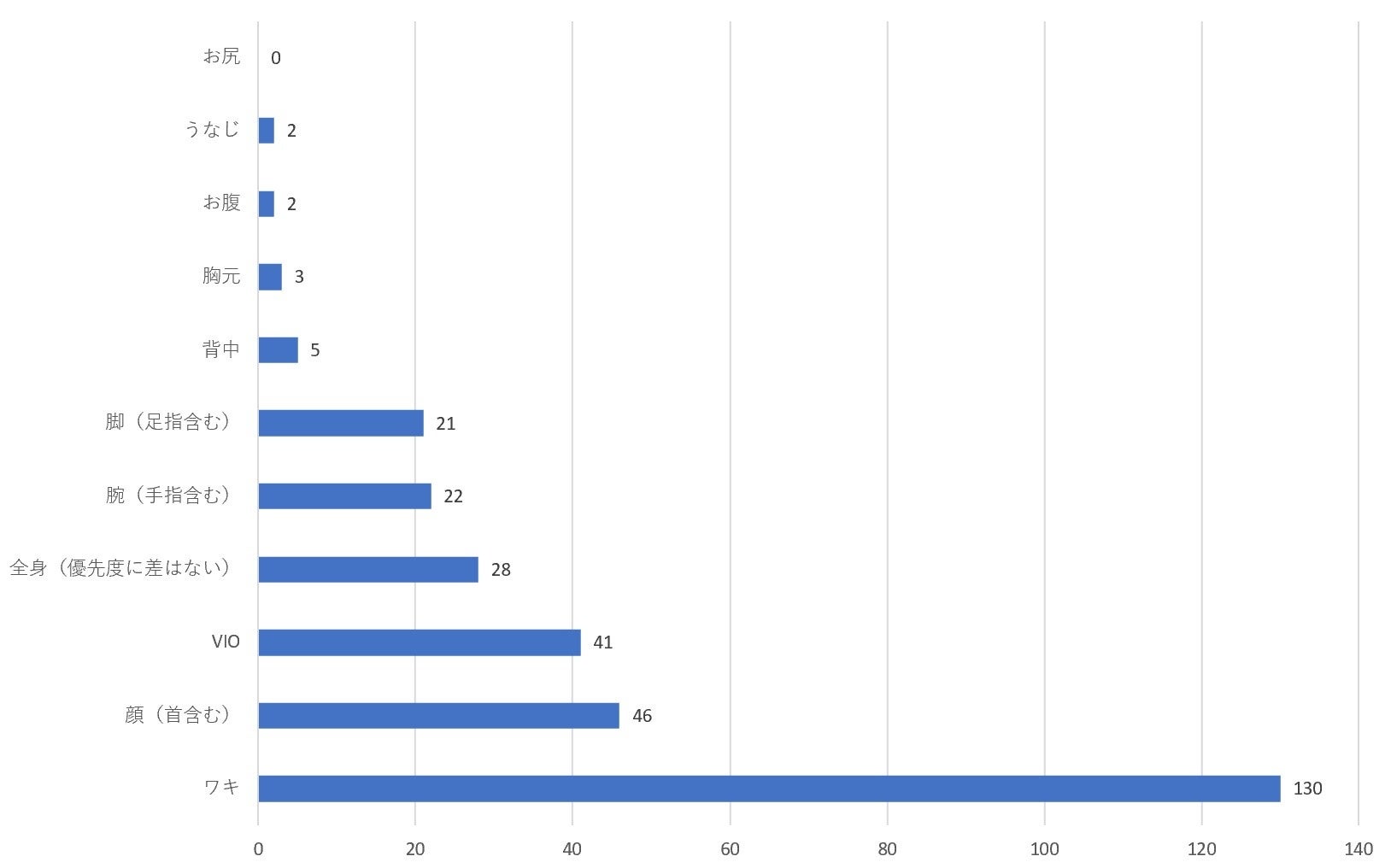 比較的毛質がしっかりしているワキ、VIO、そして骨格の凹凸で処理がしづらい顔(首含む)が、トップ3にランクインしています。このことから、自己処理の範囲ではなかなか綺麗にすることが難しかったり、処理に時間や手間がかかったりするパーツが、優先的に選ばれていることが伺えます。