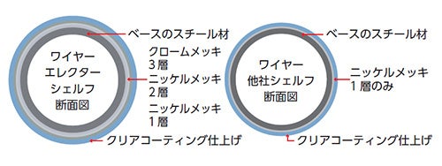 エレクターシェルフの1番の価値は「長く使えること」だからね。もちろん、リブランディング後も品質や生産体制は変わりません。例えば、ワイヤーのメッキ加工はニッケルを2回かけた後にクロムを施した3層メッキで、他のメーカーでここまでしている商品はないよね。