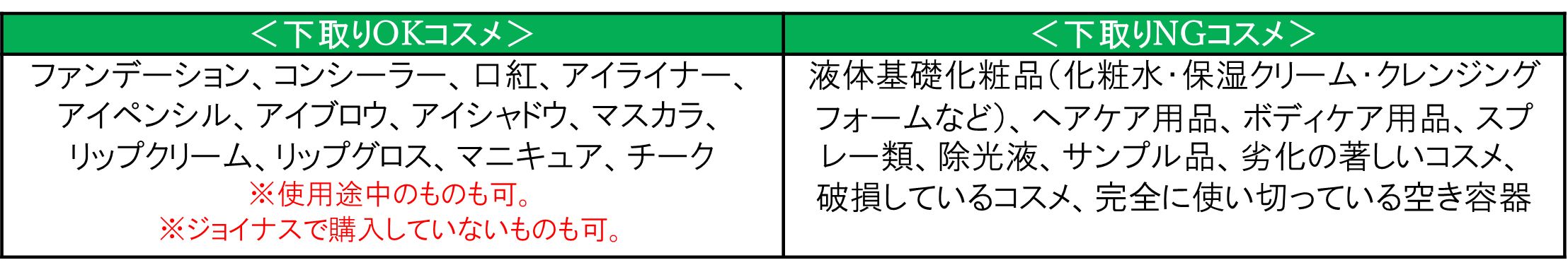 ジョイナスでは、大好評のコスメ下取りキャンペーンを今年も開催いたします。2023年3月3日(金)から5日(日)の期間中、不要なコスメをジョイナスへお持ちいただくと、3,000円(税込)以上のお買物ごとに使える500円クーポン券をプレゼント!昨年は3,000名を超えるお客さまにご参加いただきました。お持ちいただくコスメは、使用途中のものや、ジョイナス以外で購入されたものでもOK!下取りしたコスメは、国際社会支援推進会「ワールドギフト」を通じて、再利用・途上国へ寄付いたします。コスメのリユースを通じてサステナブルな活動にご参加いただける、3日間限定のチャンスです。