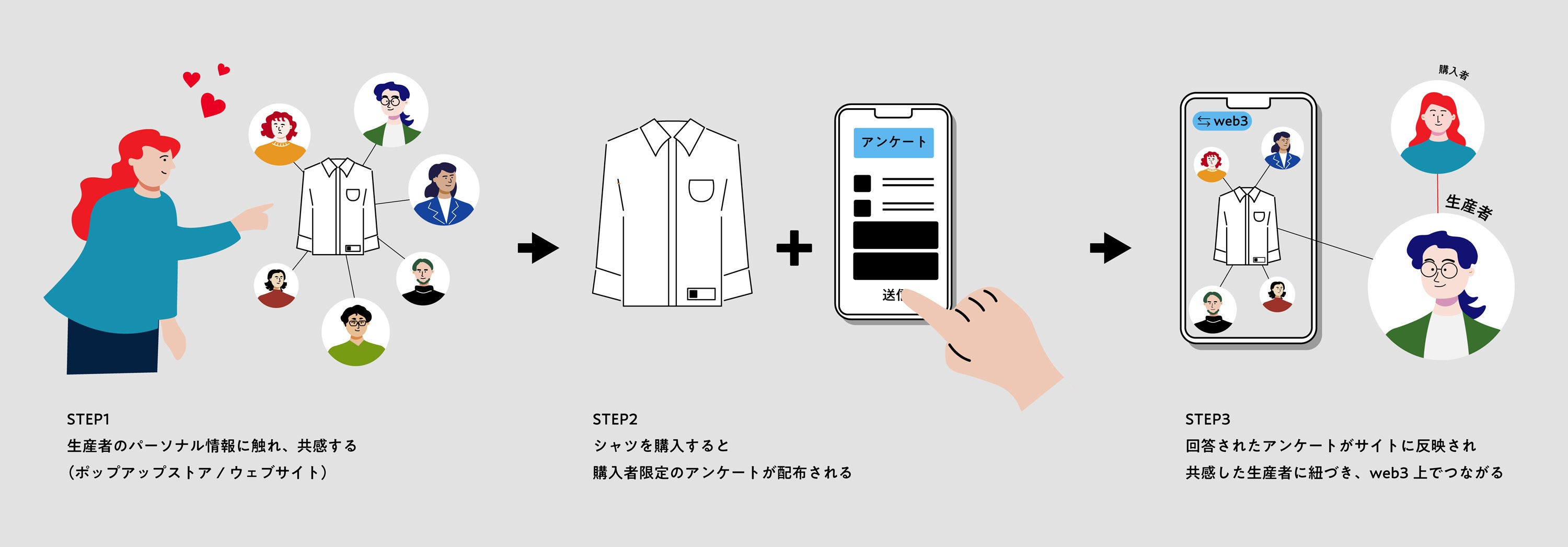 オリジナルシャツの購入者限定で回答いただくアンケート結果を元に、生産者と購入者がブロックチェーン技術を用いたWEB3.0プラットフォーム「Final Chain」を通して特設ウェブサイト上でつながります。生産者の方々のパーソナル情報に触れ、購入者の方々は誰に共感したのか。是非ご覧ください。