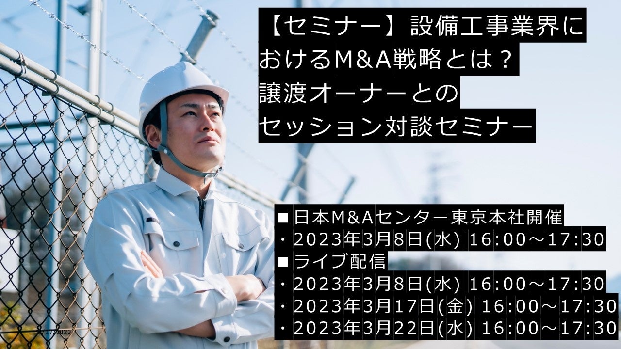 株式会社日本M&Aセンター(以下、日本M&Aセンター、本社:東京都千代田区 / 代表取締役社長:三宅 卓 / URL:https://www.nihon-ma.co.jp/)は、3月8日(水)、17日(金)、22日(水)に、設備工事業界の方に向け、同業界でM&Aを成功させた企業をお招きし業界におけるM&A戦略と成功するためのポイントを解説いたします。