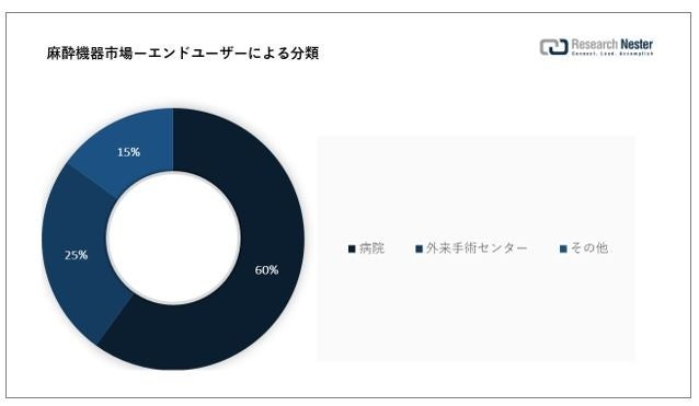 世界の麻酔装置市場は、病院、外来手術センターなどへのエンドユーザーによる需要と供給についてセグメント化および分析されています。 そのうち、病院セグメントは 2035 年末までに最大の市場規模を保持すると予想されています。このセグメントの成長は、病院数の増加と個人が病院で治療を受ける必要性のために期待されています。 さらに、人々はより良い医療施設で外科手術を受けるために病院を選択しており、これは市場でのセグメントの成長を急上昇させると予想されます。