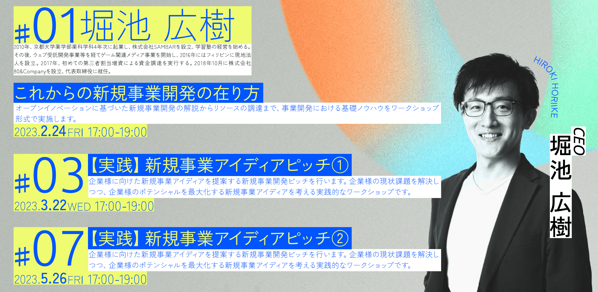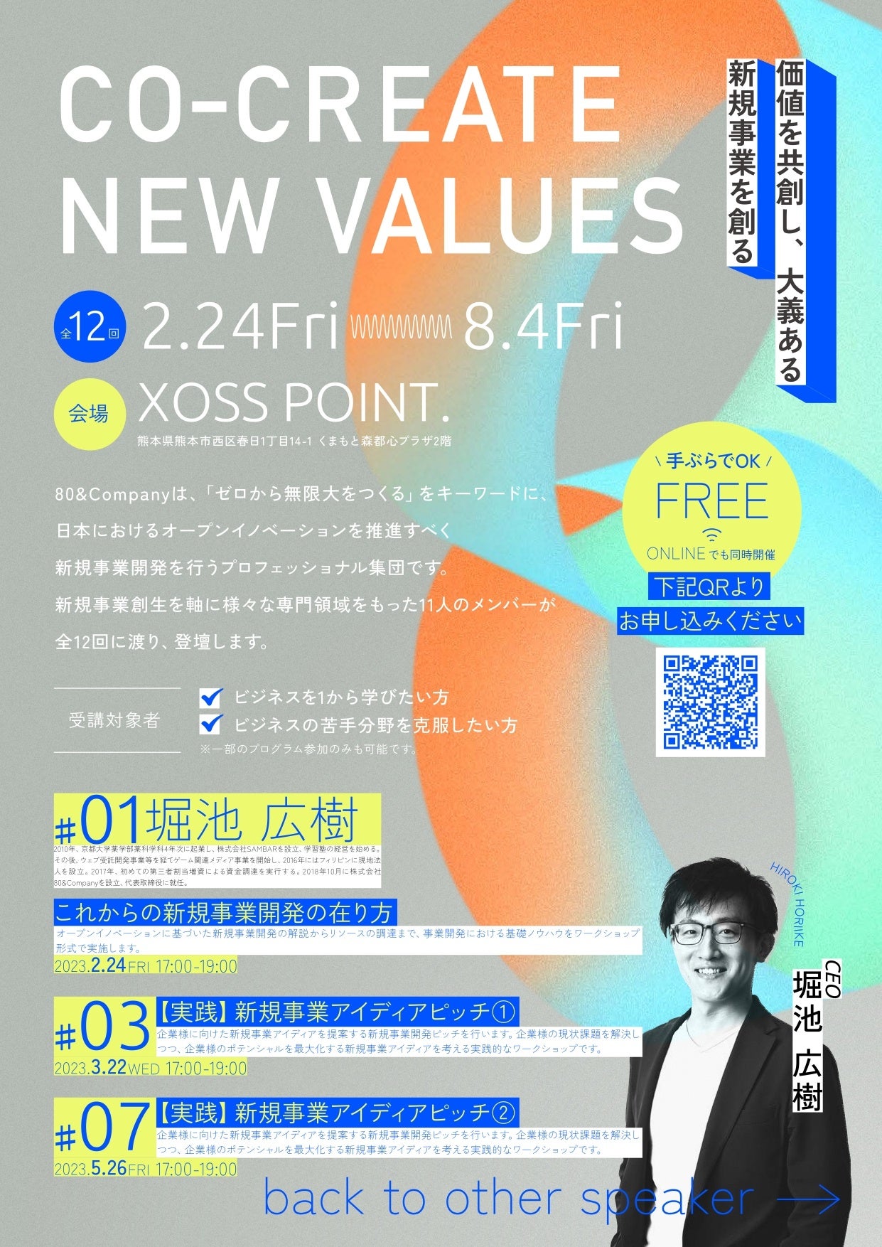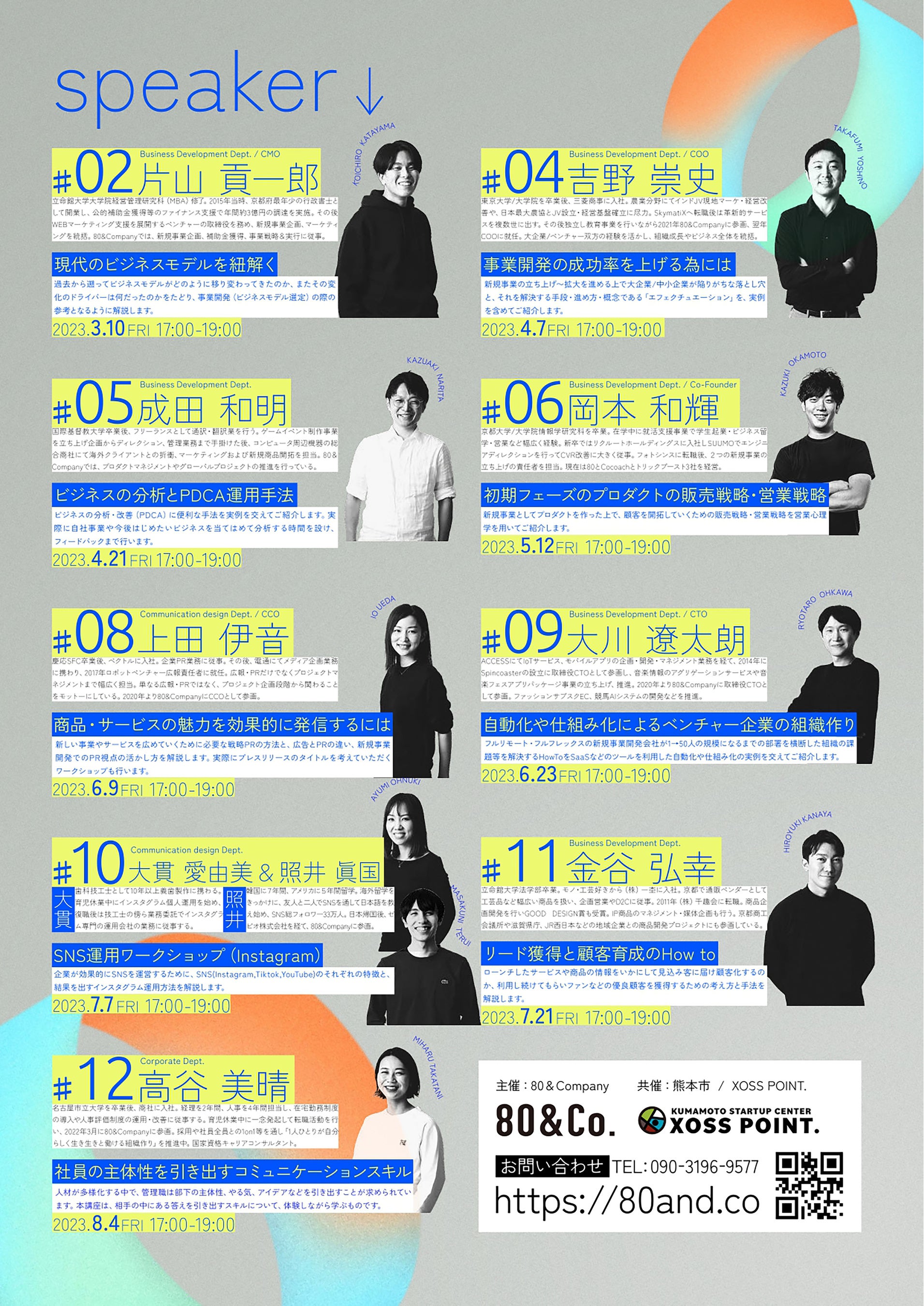 80&Companyは「ゼロから無限大をつくる」をキーワードに日本におけるオープンイノベーションによる新規事業開発を推進するプロフェッショナル集団です。今回は、熊本拠点開設を記念し、熊本市ビジネス支援施設XOSS POINT.にて全12回のセミナーを開催します。新規事業創出を軸に、様々な専門領域を持つ11人が登壇。全12回のセミナーを通して自社のポテンシャルの見つけ方から販売/営業戦略、PR、SNS運用まで新規事業におけるそれぞれのフェーズでの重要なポイントを解説、ワークショップ形式で実践的な内容の講座です。一部プログラムのみの参加も可能なのでお気軽にご参加ください。