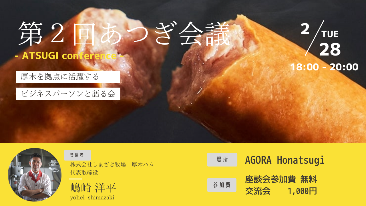 「第1回あつぎ会議」では、厚木クラフトビールの代名詞、「サンクトガーレン有限会社」代表取締役、 岩本 伸久(いわもと のぶひさ)氏が登壇。「第2回あつぎ会議」では、自社農場産のポーク「SPF豚」100%にこだわった手づくりハム&ソーセージで名が上がる「株式会社しまざき牧場 厚木ハム」代表取締役、嶋崎 洋平(しまざき ようへい)氏が登壇します。「株式会社しまざき牧場 厚木ハム」が作るソーセージは、2007年のドイツの国際コンテストで日本人初の世界ランキング3位を受賞。セミナー後には世界に認められたソーセージを試食しながら、交流会も行います。
