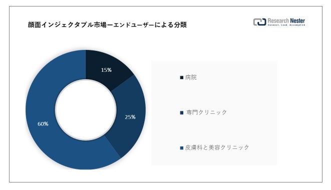 世界の顔面インジェクタブル市場は、病院、専門クリニック、皮膚科および美容クリニックへのエンドユーザーによる需要と供給についてもセグメント化および分析されています。 これらのうち、皮膚科と美容クリニックのセグメントは、2033 年までに最大のシェアを占めると予測されています。皮膚科および美容クリニックで行われる美容処置では、多数の顔面インジェクタブルが使用されています。 さらに、皮膚科および美容クリニックの設定に存在する斬新で高度な顔面インジェクタブルの存在により、セグメントのサイズが拡大すると予想されます。