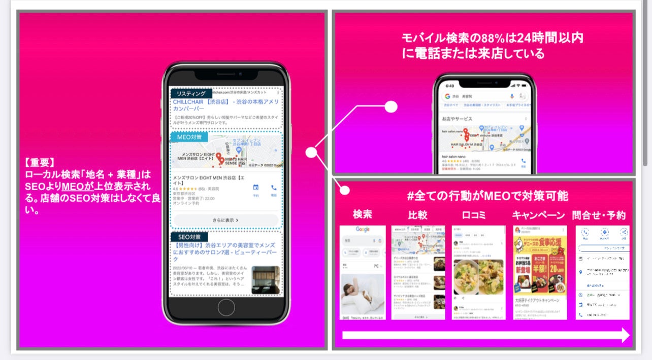 MEO対策は、店舗ビジネスや地域サービスの集客にとって必須の施策です。私たちのチームはこれまでクリニック、飲食店、マッサージ、買取事業、ネイルサロン、美容室など様々な業種を検索1位にしてきました。