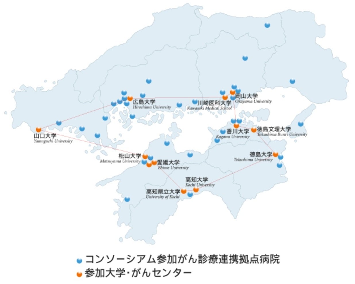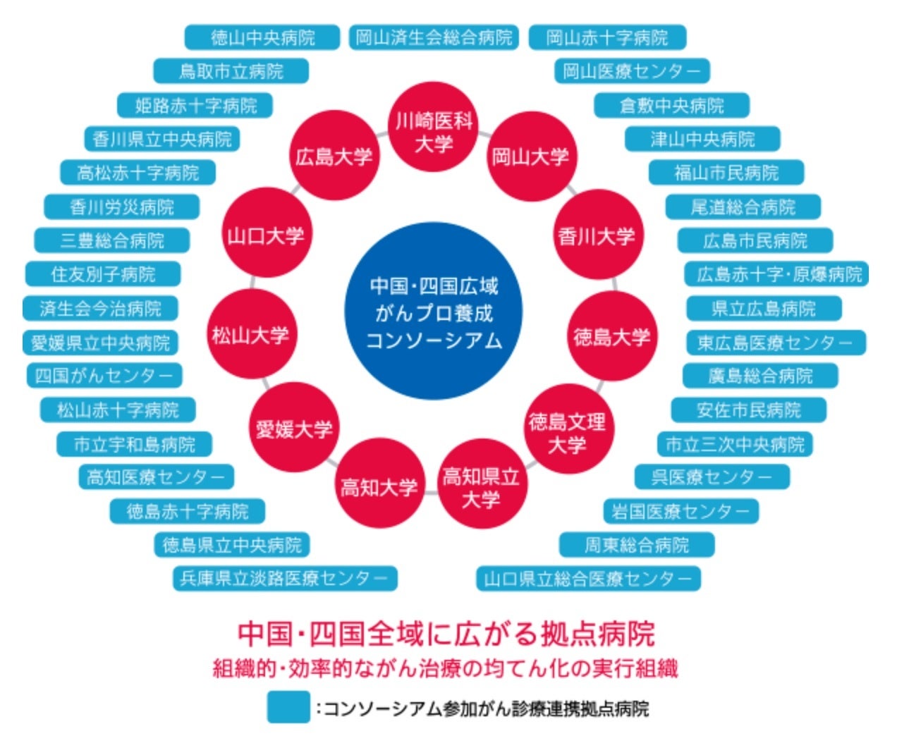 中国・四国広域がんプロ養成コンソーシアムは、中国・四国地域に位置する11大学がコンソーシアムを形成し、各大学院に多職種のがん専門医療人養成のためのコースワークを整備し、これに地域の35のがん診療連携拠点病院が連携することにより、広い地域にムラなくがん専門医療人を送り出すことを目的としています。