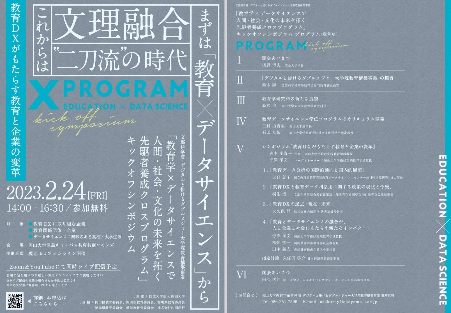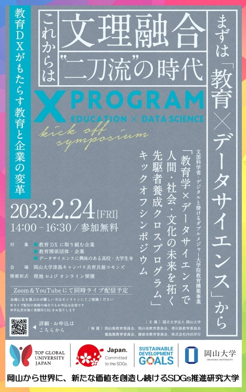 岡山大学では「教育学の専門知と ICT・DS 力を融合したトランスファラブルな力を身に付け、これを俯瞰的に活用しながら、データ駆動型社会を牽引できる先駆者」を養成する「教育・データサイエンス学位プログラム」を大学院教育学研究科に新設すべく、準備を開始しました。そのキックオフシンポジウムを2023年2月24日(金)に以下の要領で現地とzoom & YouTube同時配信のハイブリッド形式で開催します。