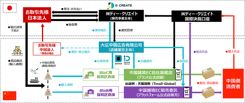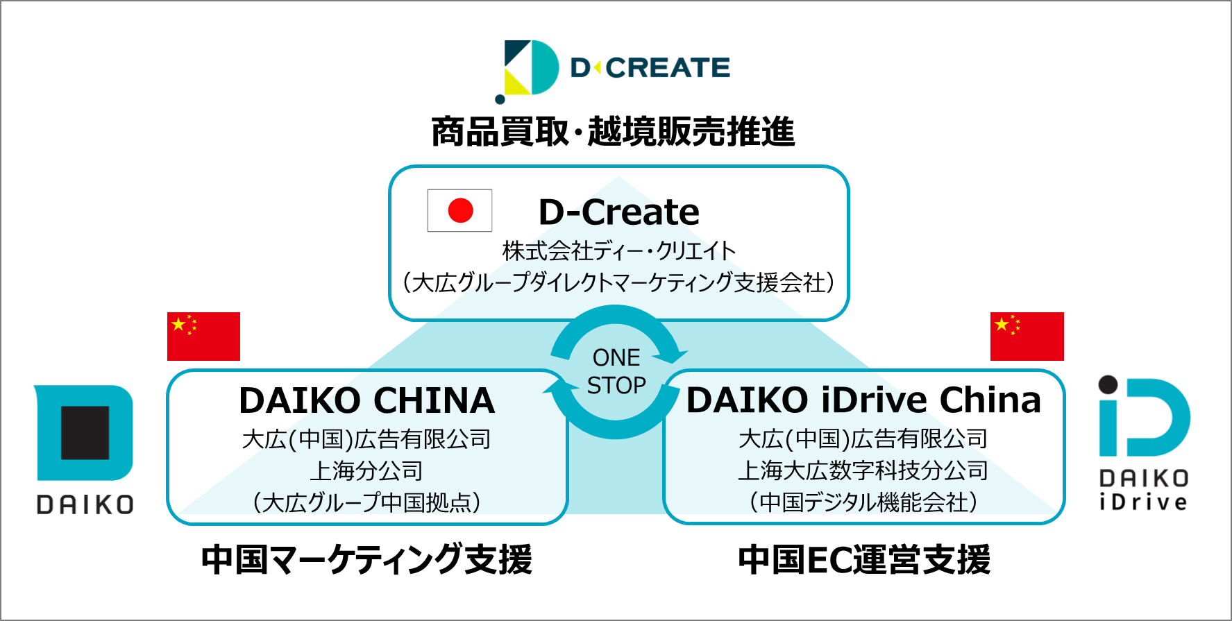 今回、大広(中国)広告有限公司が保有する中国EC販売の知見と、ディー・クリエイトが保有する顧客に直接的に商品販売を行うダイレクトマーケティング知見を融合。クライアント様の商品の仕入れ買い取りおよび貿易(物流/倉庫)運営・販売管理を日本側のディー・クリエイトが行い、中国越境ECを通じて中国消費者に直接販売を行うEC運営サービスを上海市に拠点を置く大広中国が行う、ワンストップ越境販売サービスを提供します。