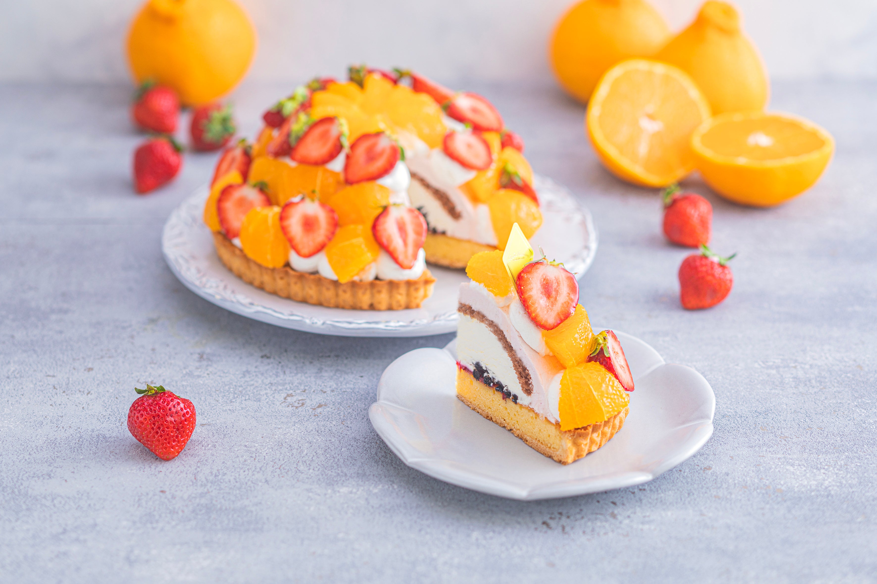 しっとりとしたケークタルトに優しい甘さのミルククリームといちごクリームを重ね、みずみずしい不知火と甘酸っぱいあまおうを贅沢に飾りました。