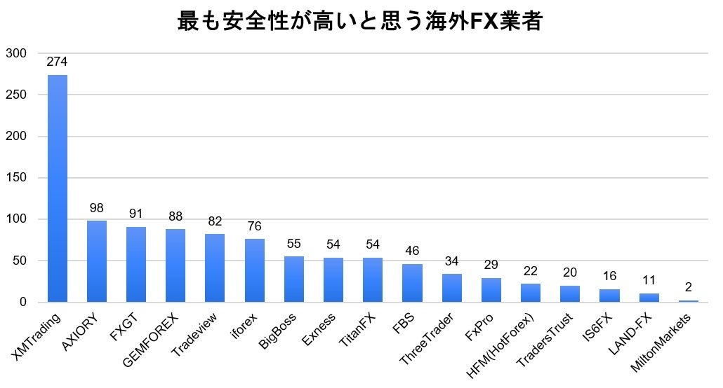 アンケート結果では最も安全だと思う海外FX業者は1位がXMTrading、2位AXIORY、3位FXGTとなりました。