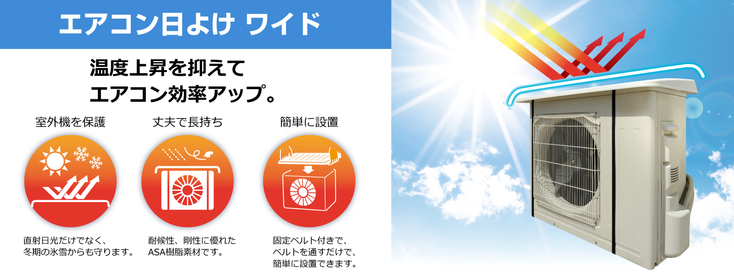 コロナ禍の外出自粛やリモートワーク普及によりおうち時間が増え、2020年以降エアコンの販売台数は過去最高を記録しています。また、今年も猛暑となる見通しが気象庁からも発表され、政府からは燃料高沸による節電要請も出ています。そのため、今年の夏はよりエアコンを効率的に使用することが求められ、より節電しようという消費者のニーズに応え、「エアコン日よけ ワイド」を開発しました。夏だけでなく、冬期、室外機の氷雪被害低減にも使用できるように耐候性にこだわりました。近年主流のワイドタイプの室外機にも対応するサイズです。