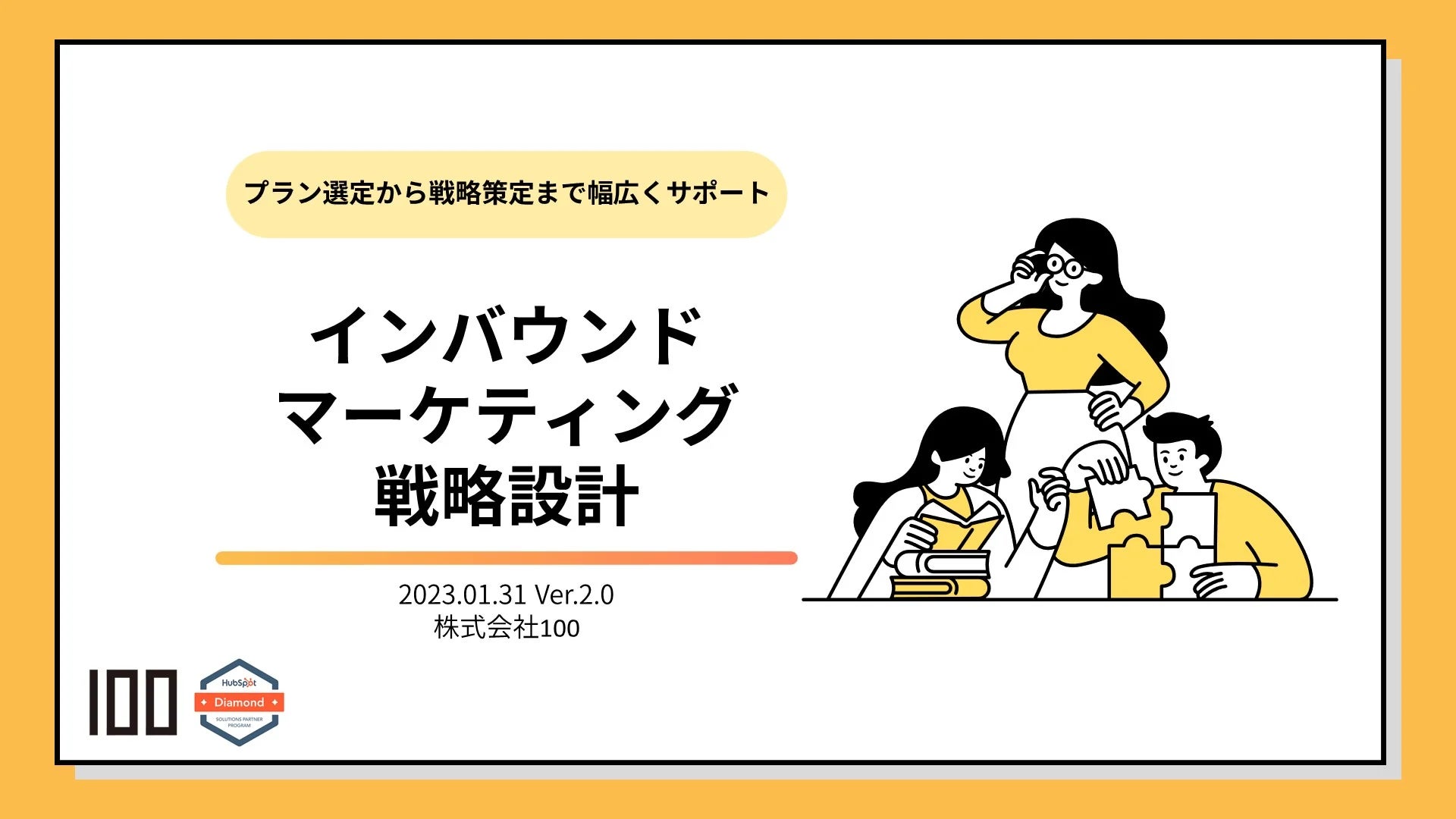 株式会社100では、お客様のビジネス内容や現在の業務フローに合わせて最適なインバウンドマーケティング戦略および設計支援をサポートさせていただきます。今回の資料を参考に、何かご相談あれば気軽にご連絡ください。
