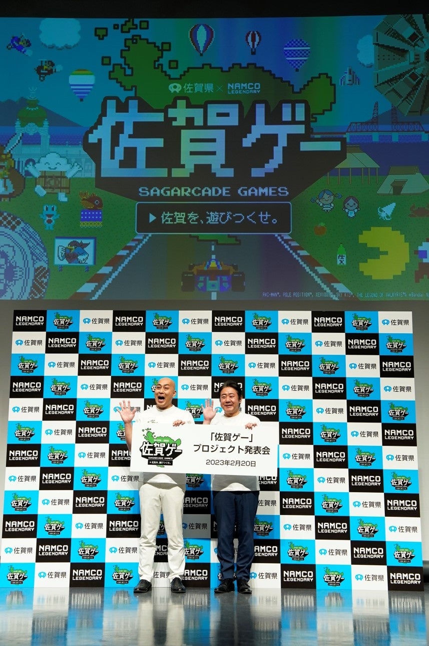 佐賀県は、情報発信プロジェクト「サガプライズ!」の事業の一環として、株式会社バンダイナムコエンターテインメントの人気ゲーム「パックマン」をはじめとした名作ゲーム5タイトル(パックマン・ポールポジション・ゼビウス・スカイキッド・ワルキューレの伝説)とコラボし、ゲームで佐賀県を遊んでもらうプロジェクト「佐賀ゲー」を公開しています。2月20日(月曜日)にコラボゲーム『パックマン佐賀県ver.』と名作ゲーム5タイトルとの「コラボGIFアニメ」の公開に合わせて、人気お笑い芸人 錦鯉のお二人をゲストとしてお招きし「佐賀ゲー」プロジェクト発表会を、渋谷ストリームホールにて開催しました。