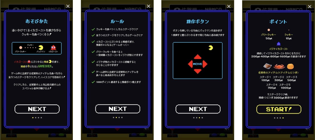 佐賀県とパックマンがコラボした「パックマン佐賀県ver.」をご用意させていただきました。呼子のイカに扮したゴーストから逃げつつ、佐賀県のアイテムをゲットしていくことで、佐賀県情報にどんどん触れていく仕掛けとなっております。ぜひプレイして佐賀県をお楽しみください。