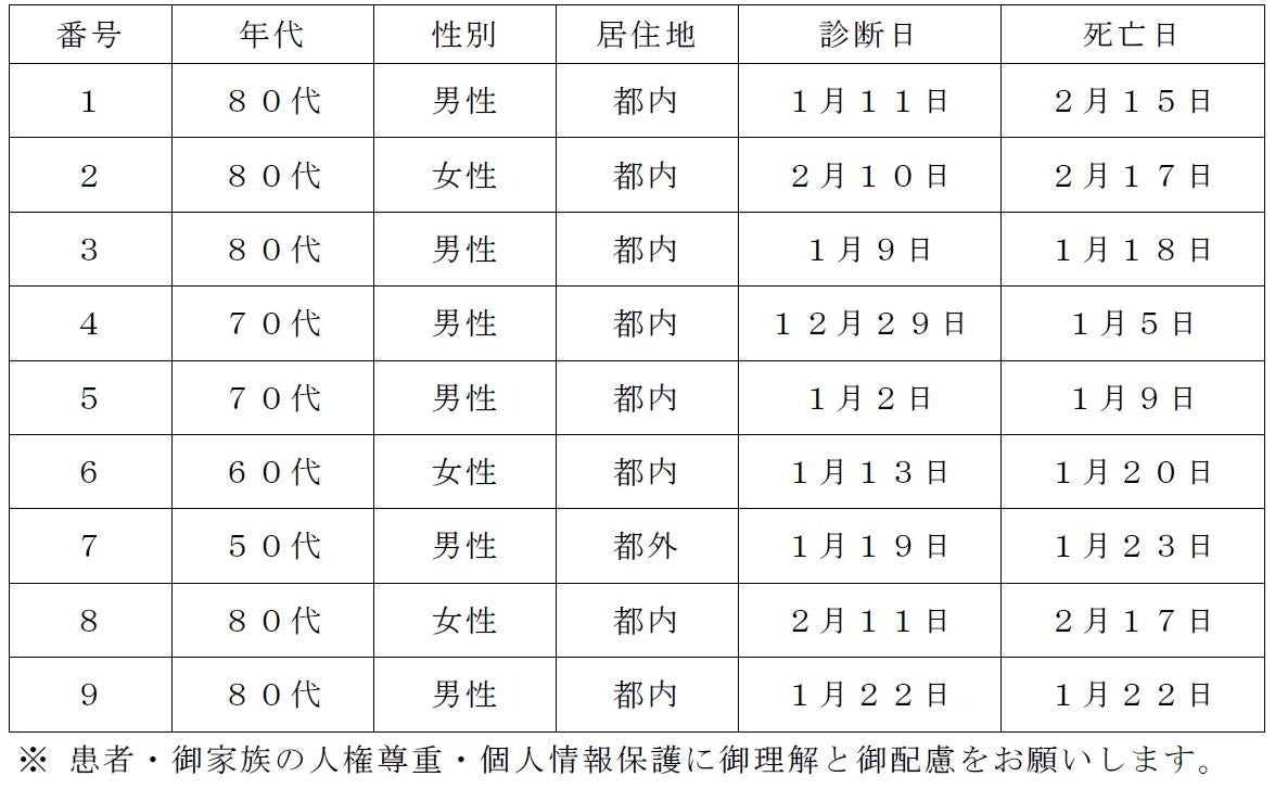 新型コロナウイルスに関連した患者の死亡について business Twitter Facebook はてブ Pocket LINE コピー 2023.02.20 この記事は約1分で読めます。 都内で新型コロナウイルスに感染した方が死亡されましたのでお知らせします。 お亡くなりになった方のご冥福をお祈り申し上げます。 1 新型コロナウイルスに関連した死亡者(本日公表分) 2 新型コロナウイルスに関連した死亡者の累計 7,902人