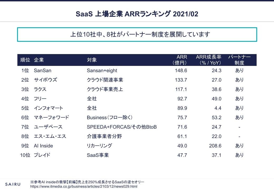 2021年2月時点で上場しているSaaS企業のARR(Annual Recurring Revenue:年間経常収益)金額が大きい企業のランキング上位10社のうち、実に8社がパートナー制度を展開しています。このことからも、代理店戦略はSaaS企業にとって成長を加速するための重要な手段の1つと言えるでしょう。