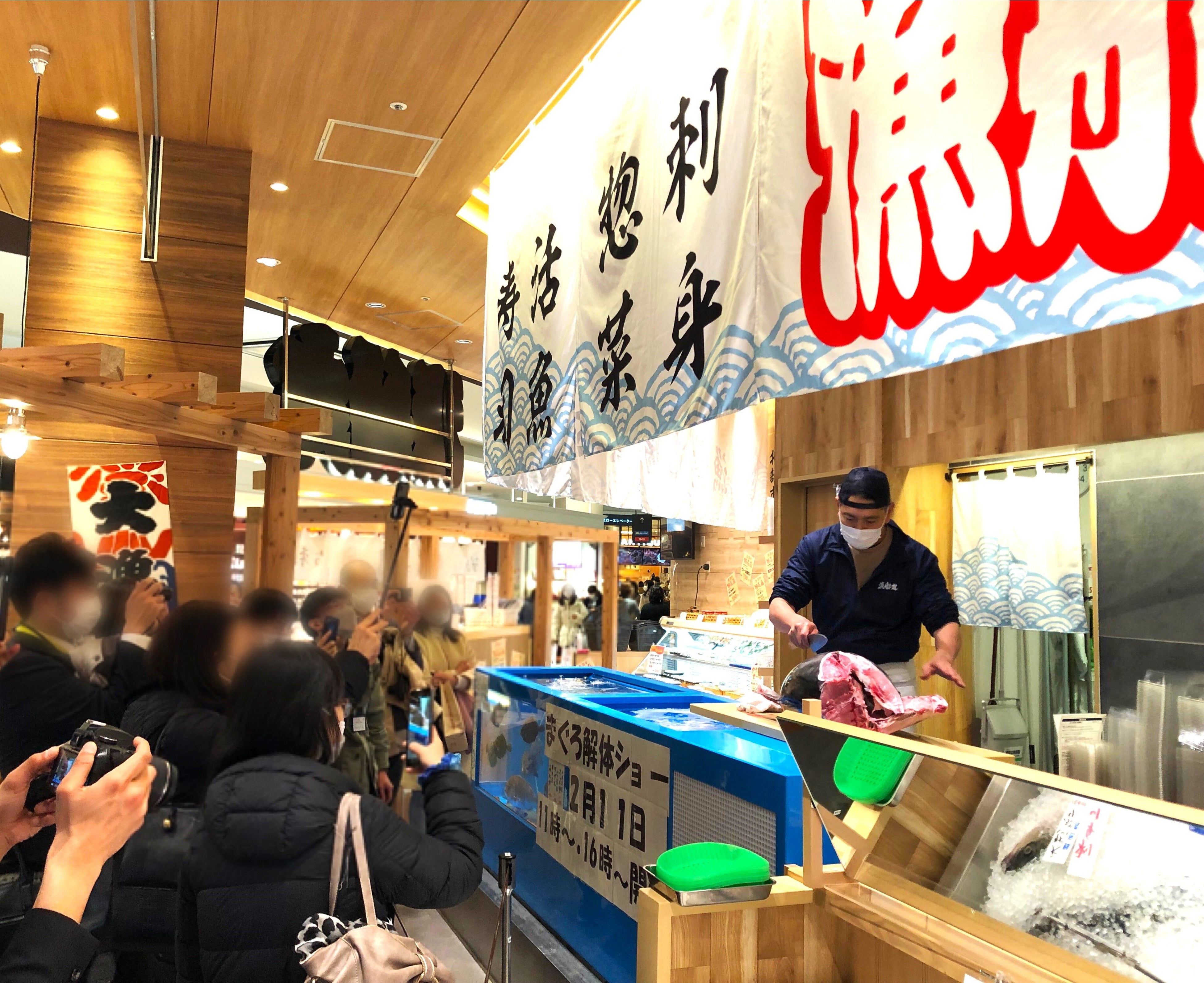 そこで当社では、他にはない強みを広く発信すべく、2月から同店舗で定期開催する「まぐろ解体ショー」のニュースをフックにプレスリリースを作成・配信するとともに、メディアを誘致したレセプションを2月7日に開催いたしました。メディアレセプションでは「まぐろ解体ショー」を実演、その後さばきたての魚を試食していただき、店の魅力を体感していただくことで記事掲載を促し、メディアを通じて広く認知促進をはかりました。