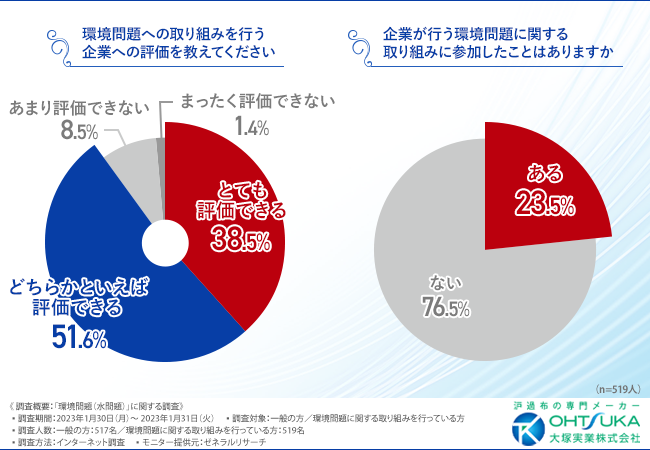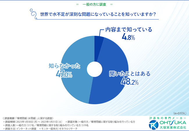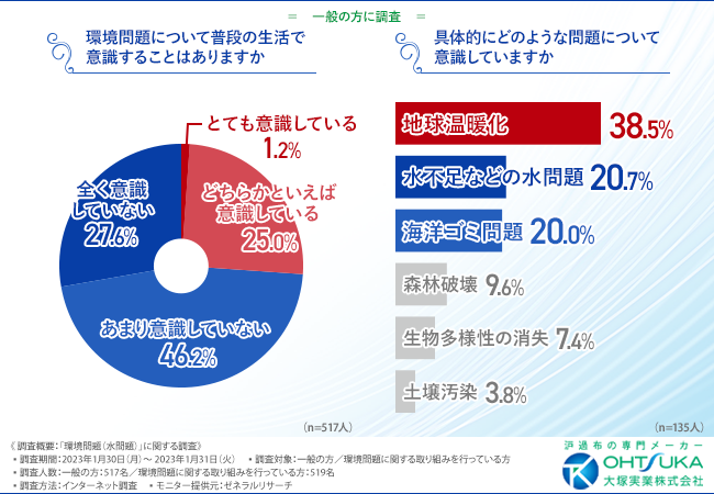 そこで、創業50年のろ過布の製造メーカー大塚実業株式会社(https://ohtsuka-jitsugyo.com/)は、一般の方/環境問題に関する取り組みを行っている方を対象に、「環境問題(水問題)」に関する調査を行いました。