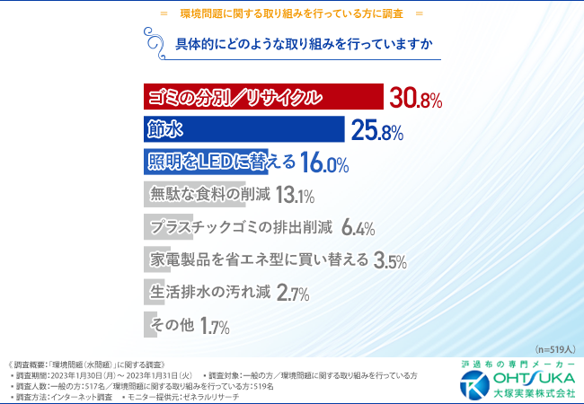 「具体的にどのような取り組みを行っていますか?」と質問したところ、『ゴミの分別/リサイクル(30.8%)』と回答した方が最も多く、次いで『節水(25.8%)』『照明をLEDに替える(16.0%)』と続きました。