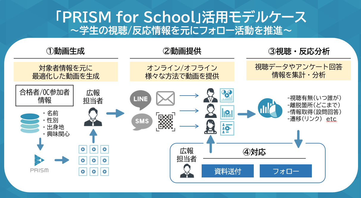 パーソナライズド動画生成テクノロジー「PRISM」を活用し、学生の属性や興味関心に合わせて一人ひとりに最適化した動画を簡便かつリーズナブルに提供できます。