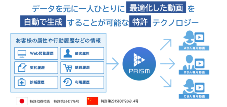「PRISM」※はユーザー情報をもとにサーバ上で自由に動画を組み合わせ合成することで、ユーザーの特性に最適化した動画を大量かつリアルタイムに生成し提供することが可能な動画ソリューションです。