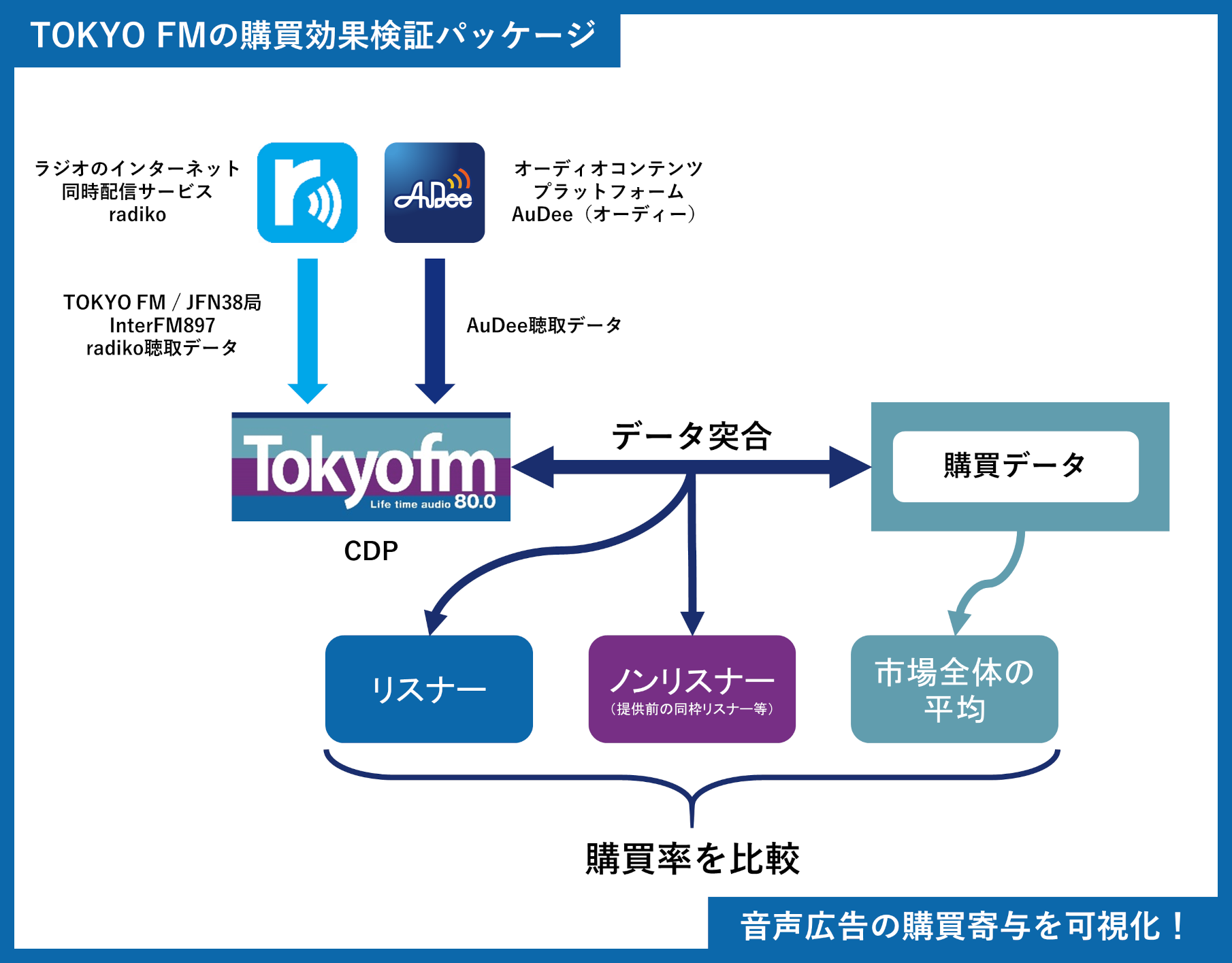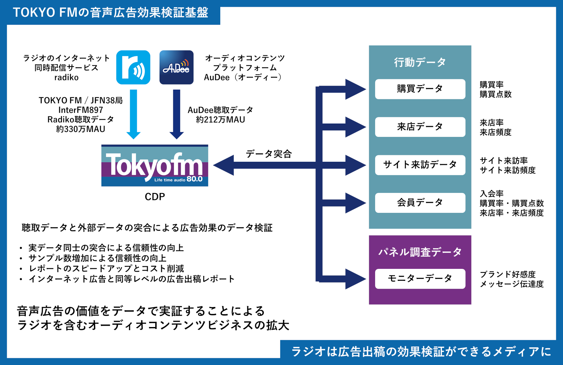 TOKYO FMはradiko聴取データ等を用いたCDPによる音声広告効果検証基盤を構築、TOKYO FM/JFN38局のラジオ、およびTOKYO FMが運営するオーディオコンテンツプラットフォーム「AuDee(オーディー)」などの音声広告が商品購買につながるデータ実証を重ねてきており、そのノウハウを蓄積してまいりました。