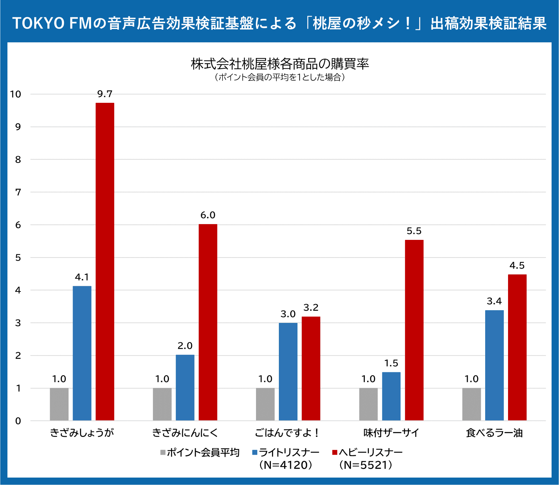その結果、本コーナーで取り上げた株式会社桃屋の各商品について、「ポイントカード会員平均」と比べて、本コーナーの聴取者は購買率が高く、「ライトリスナー」よりも「ヘビーリスナー」の購買率はさらに高まっているため、フリークエンシー効果も明瞭に出ています。