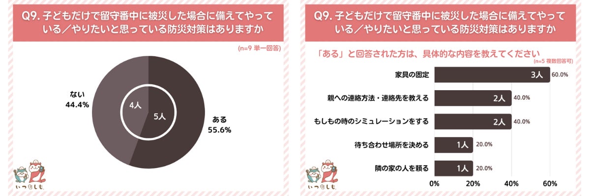 具体的な対策として、家具の固定親への連絡方法子どもだけで身を守る方法を教えているというママが多かったです。