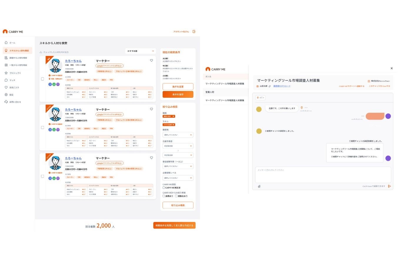 「キャリーミーダイレクト」は、プロ人材1万人以上とオンライン上でマッチングできるプロ人材特化型採用マッチングプラットフォームです。