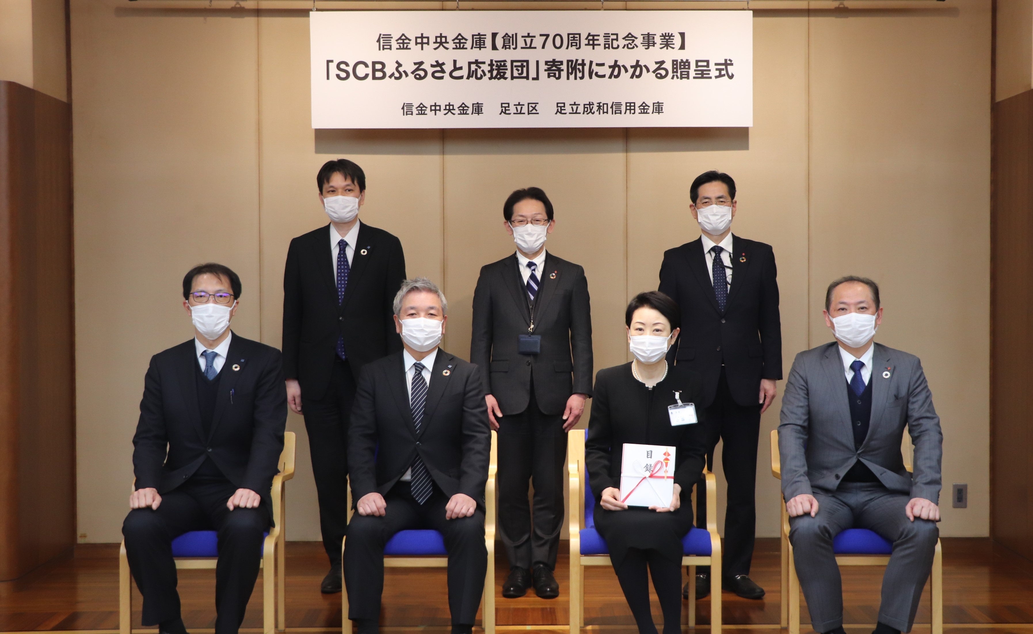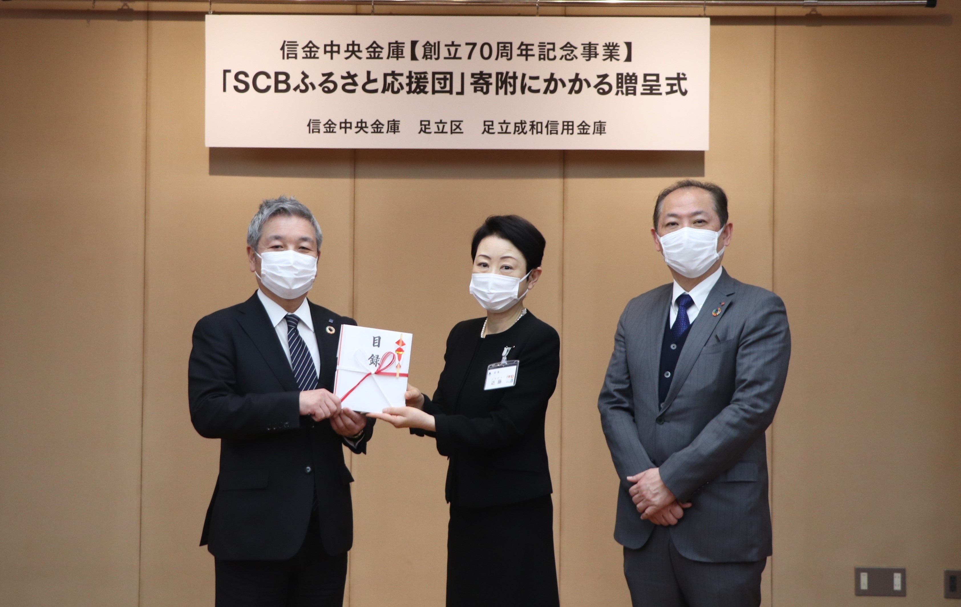 贈呈式では、信金中央金庫の須藤浩(スドウヒロシ)副理事長より足立区長に目録を贈呈。区が提案したプロジェクトを推薦した足立成和信用金庫の土屋武司(ツチヤタケシ)理事長も出席しました。