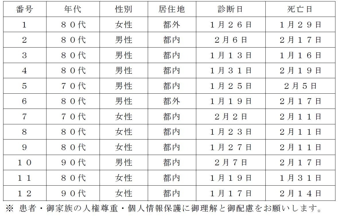 新型コロナウイルスに関連した患者の死亡について business Twitter Facebook はてブ Pocket LINE コピー 2023.02.21 この記事は約1分で読めます。 都内で新型コロナウイルスに感染した方が死亡されましたのでお知らせします。 お亡くなりになった方のご冥福をお祈り申し上げます。 1 新型コロナウイルスに関連した死亡者(本日公表分) 2 新型コロナウイルスに関連した死亡者の累計 7,914人