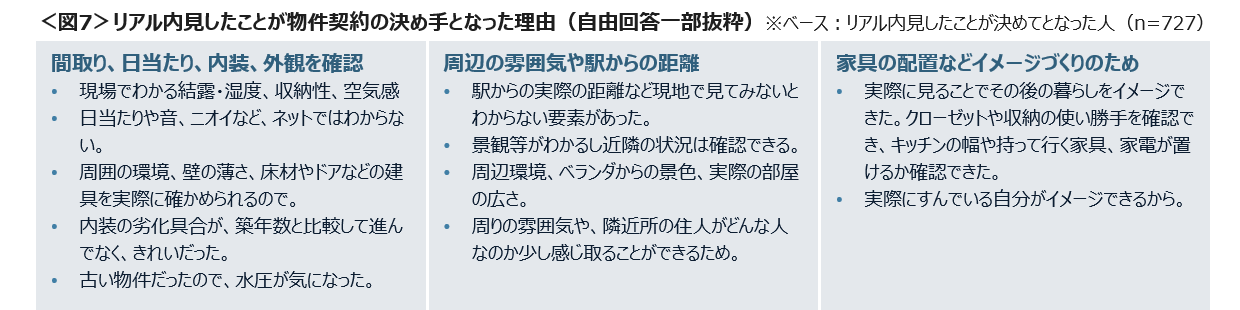 リアル内見したことで物件契約にいたった人にその決め手を確認した。多くの人が、間取り、広さ、日当たり、景色、音、きれいさなど部屋と外観の状態を確認していた。また、駅からの距離や近隣の雰囲気などの周辺情報を得たり、持っている家具や家電が配置できるかなど、引っ越ししてからの生活をイメージできるかが、決め手になっている。<図7>