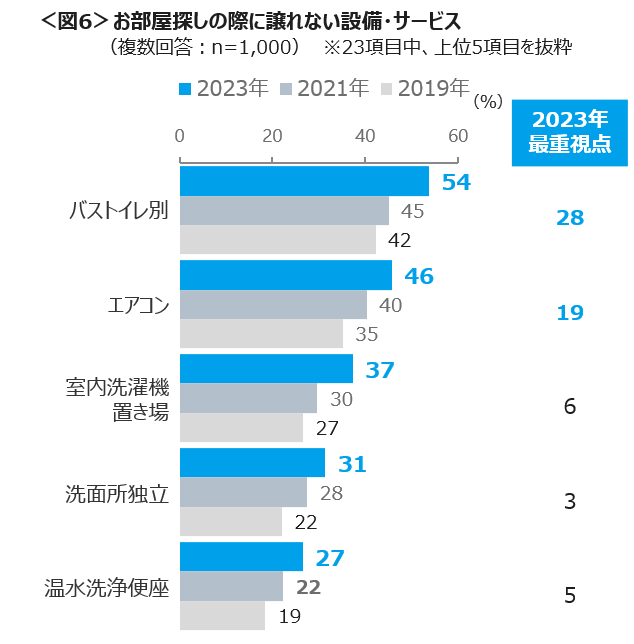 お部屋探しの際に譲れない設備・サービス(複数回答)は、「バストイレ別」が54%、「エアコン」46%、「室内洗濯機置き場」37%など。上位にあげられた譲れない設備・サービスは、2019年、2021年と年々高くなる傾向にある。最も譲れない設備・サービス(単一回答)は、「バストイレ別」28%、「エアコン」19%が中心である。<図6>
