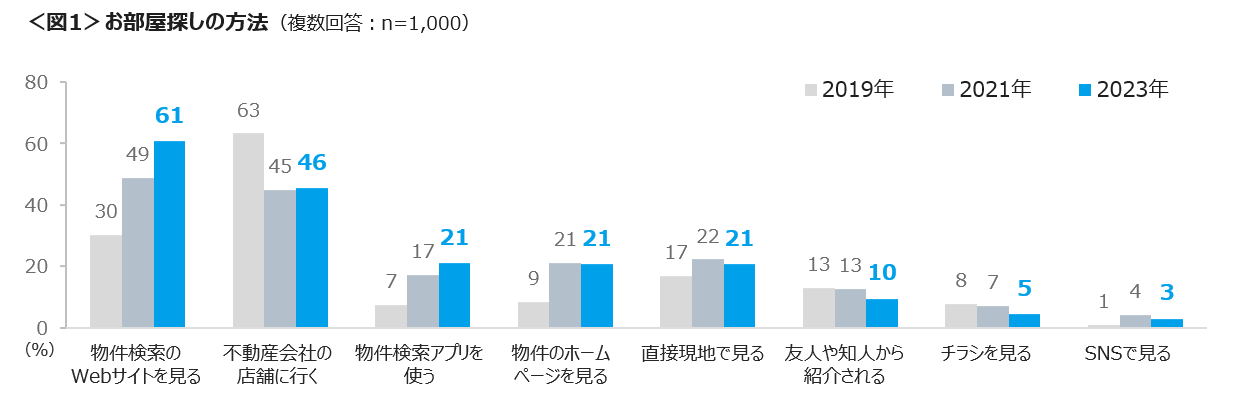 ここ2年間に賃貸物件に引っ越しした人のお部屋探しは、「物件検索のwebサイトを見る」が61%と「不動産会社の店舗に行く」の46%がメイン。「物件検索のwebサイトを見る」は2019年と比べ2倍となり、浸透しているといえる。「不動産会社の店舗に行く」は、2021年から横ばいである。<図1>