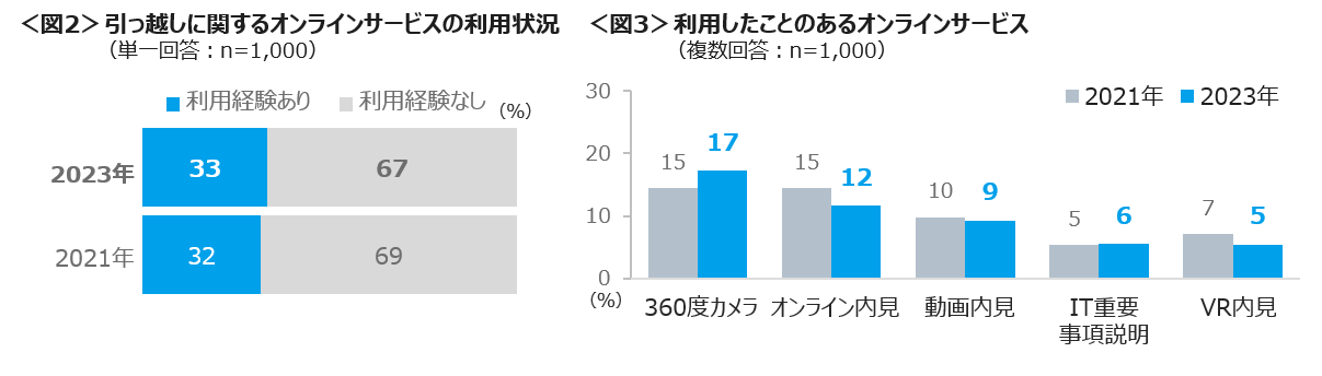引っ越しに関わるオンラインサービスの利用率は33%。利用率が高いオンラインサービスは「360度カメラ」「オンライン内見」「動画内見」など。2021年と比べ、利用率や利用したサービスに大きな変わりはない。<図2,3>