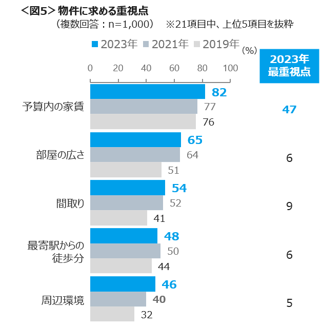 物件に求める重視点(複数回答)は、「予算内の家賃」が82%と2021年より5p上昇と高まっている。次いで多い「部屋の広さ」「間取り」は、2021年と同様の結果である。家賃相場が上昇していることもあり、最も重視する点(単一回答)は、「予算内の家賃」が47%と群を抜いている。<図5>