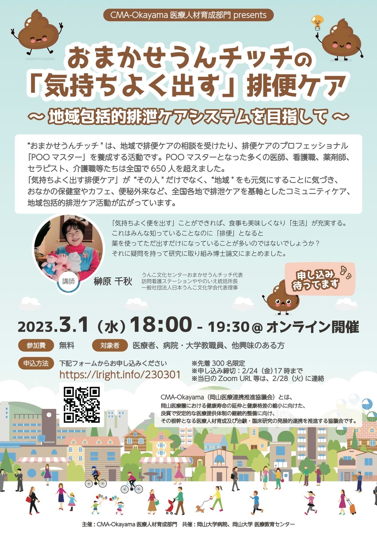 国立大学法人岡山大学(本部:岡山市北区、学長:槇野博史)の岡山大学病院と大学院医歯薬学総合研究科医学教育センターは、CMA-Okayama(岡山医療連携推進協議会)医療人材育成部門主催で2023年3月1日(水)にオンライン開催されるセミナー「おまかせうんチッチの「気持ちよく出す」排便ケア 〜地域包括的排泄ケアシステムを目指して〜」に共催します。