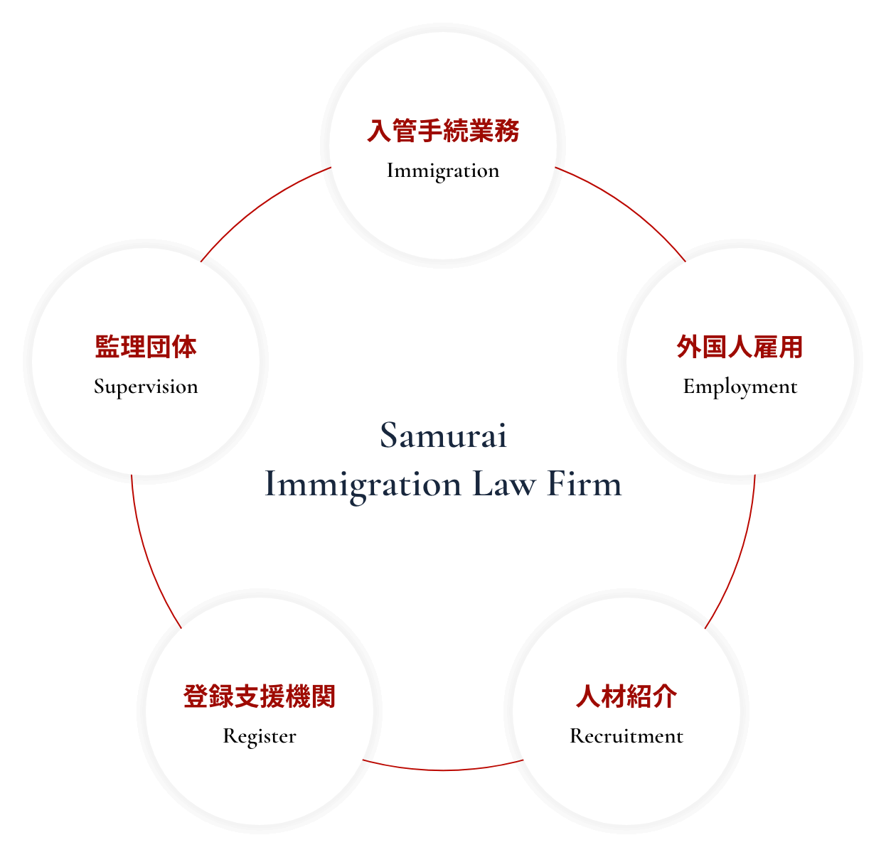 さむらい行政書士法人は、外国人雇用に関する支援をワンストップで対応。在留資格申請をはじめとした入管手続業務のみならず、外国人材の受入れ体制の構築から人材紹介、受入の運営支援まで総合的なサポートを提供しています。