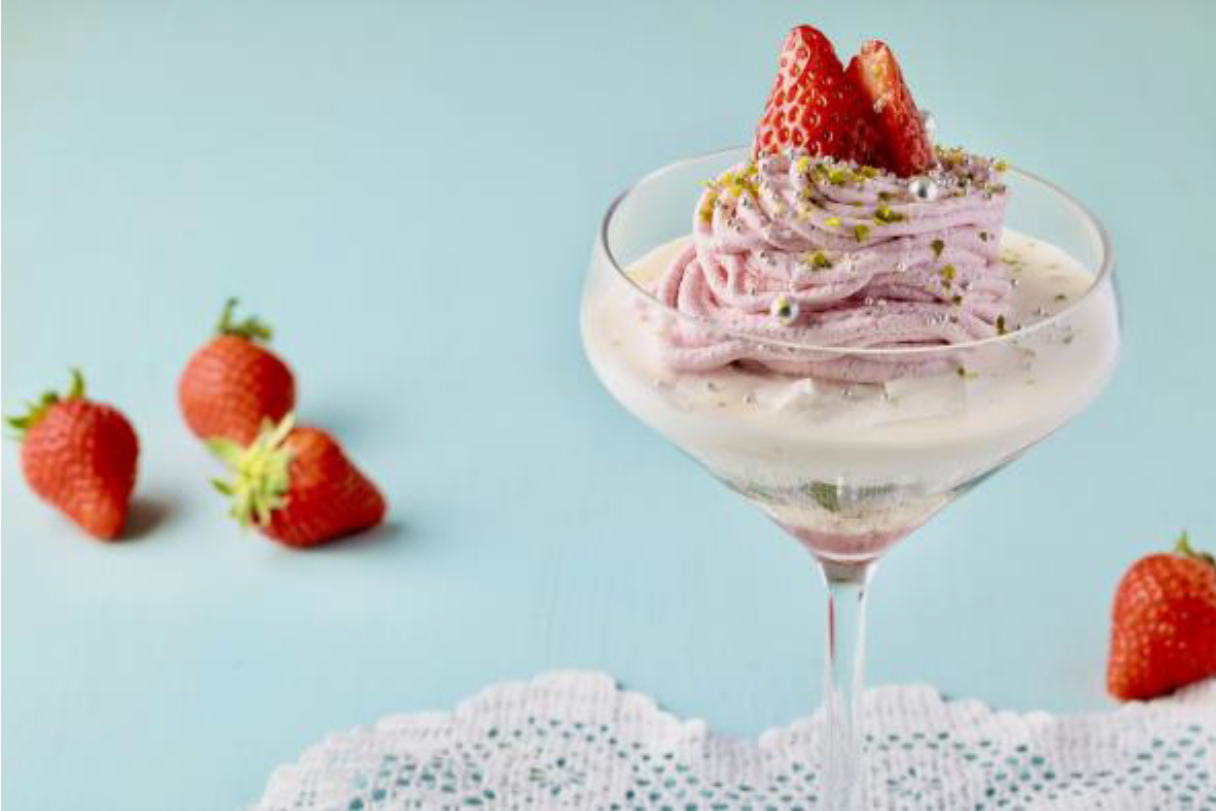 春らしい彩り鮮やかな層がとても可愛らしく、見た目も味も楽しめる一品です。苺モンブランクリーム、苺ソース、フレッシュ苺などさまざまな食感をお楽しみください。