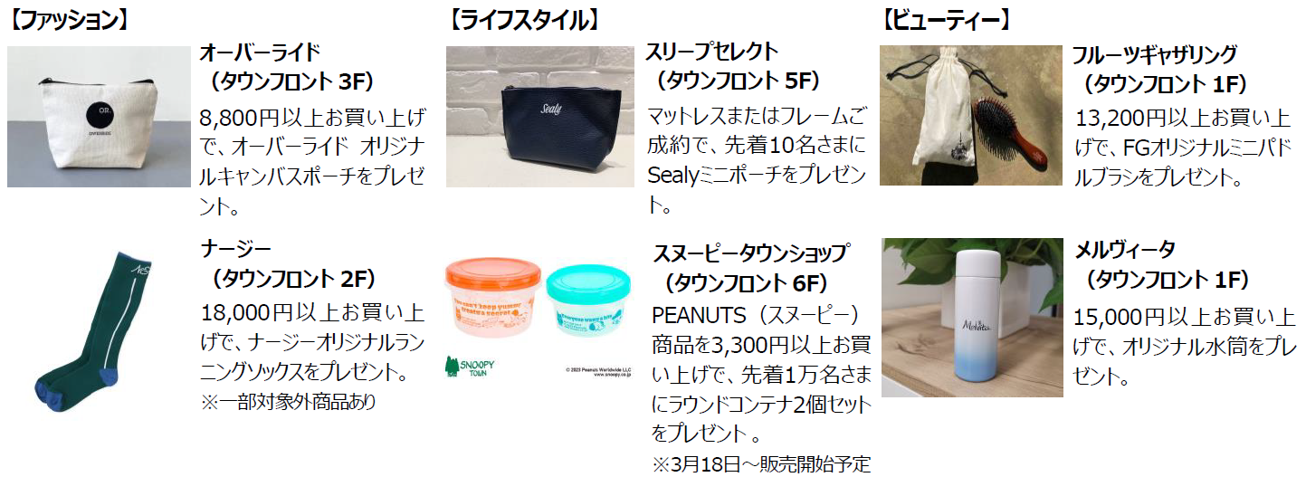 限定アイテム以外にも、多くの店舗で12th Anniversaryの感謝を込めたさまざまな特典をご用意します。ファッション性の高いオリジナルのポーチや人気キャラクターのラウンドコンテナ(お弁当箱)など、うれしい特典が満載で、春のショッピング体験を後押しします。