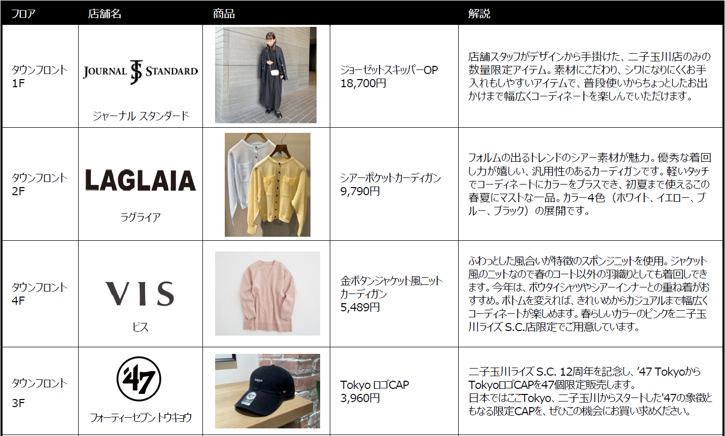 「ジャーナル スタンダード」「ラグライア」「ビス」など、二子玉川ライズ S.C.の人気ファッションブランドから春らしいカラーの限定アイテムが登場するほか、「フォーティーセブン トウキョウ」ではオリジナルの限定キャップを販売。さらに「サーモス スタイリングストア」「エトヴォス」などライフスタイルやビューティーショップからも12th Anniversaryを記念した二子玉川ライズ S.C.限定アイテムを展開します。ここでしか手に入らない特別な商品は、どれも春をより楽しく彩ること間違いなしの限定アイテムです。