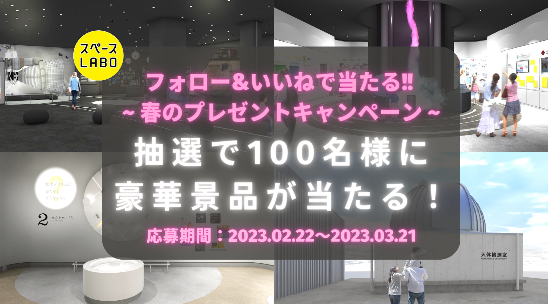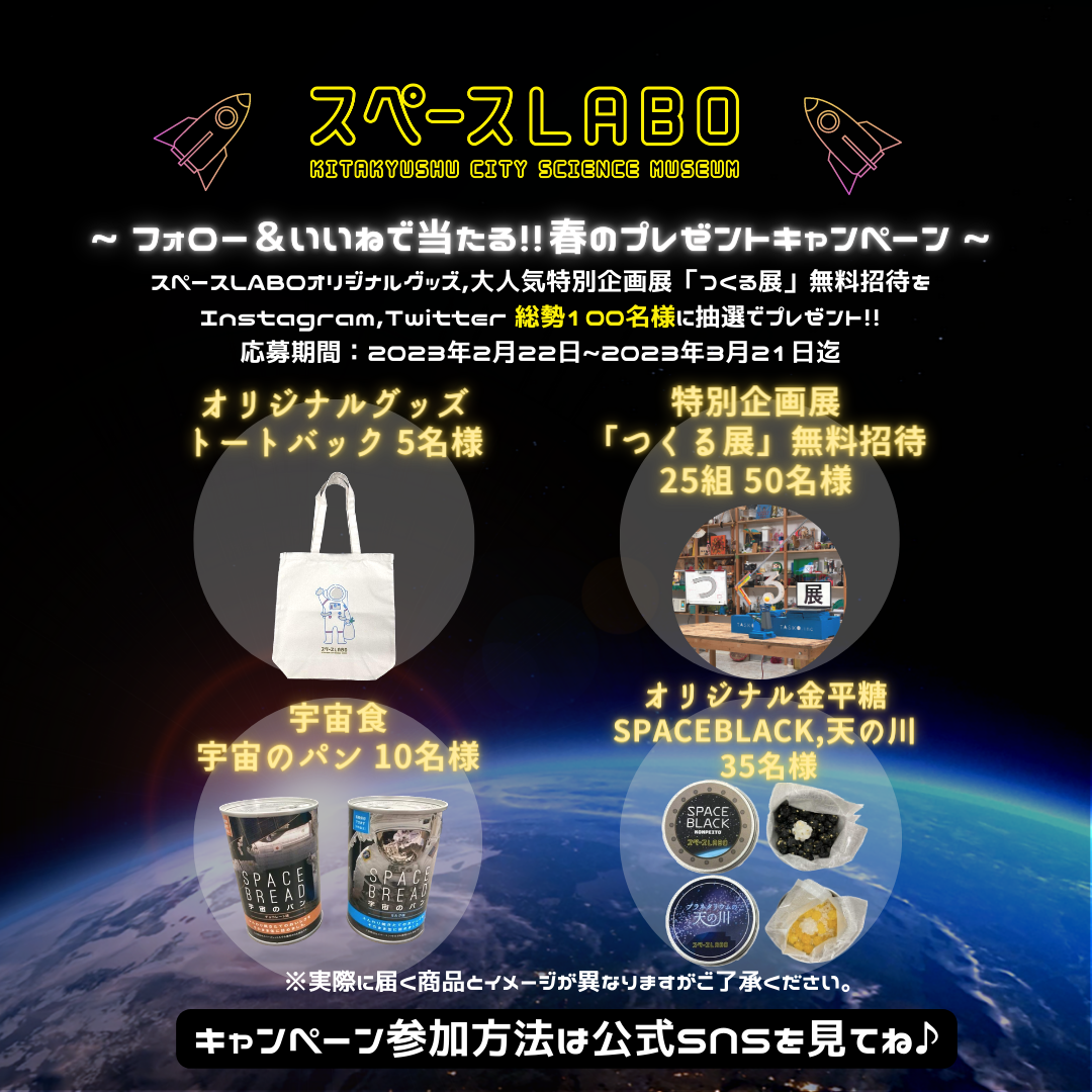 北九州市科学館「スペースLABO」は、2023年2月22日(水)から 2023年3月21日(火)にかけて、SNS公式アカウントにて、プレゼントキャンペーンを開催します。対象のSNSアカウントを持つ方は誰でも参加可能なので、是非ご参加ください。